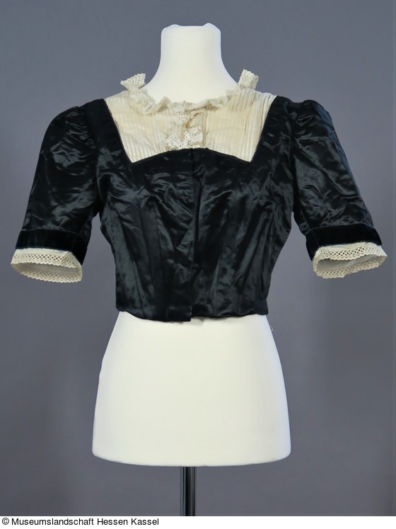 Mieder (Oberteil eines Damenkleides?) aus schwarzem Satin mit Bluseneinsatz