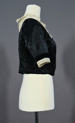 Die kurzen Ärmel sind an den Säumen mit schwarzem Samtband eingefasst, darunter liegt glatt eingesetzte, weiße Stickereispitze.