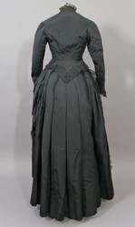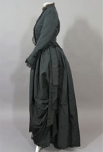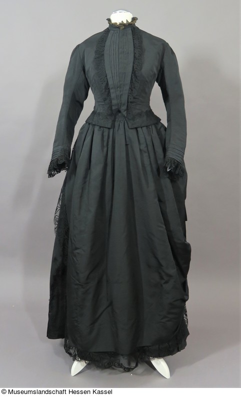Das zweiteilige Tournürenkleid aus shwarzem Seidenrips ist hochgeschlossen und hat lange Ärmel.