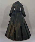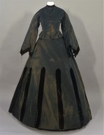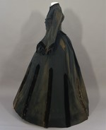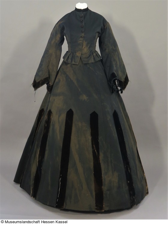 Das Kostüm stammt aus der Zeit zwischen 1860 und 1865. In dieser Zeit wurden die Röcke über ausladenden Krinolinen getragen, die vorne flach waren, dafür nach hinten schräg ausschwangen. Für diese Krinolinenform ist der Rock geschnitten. Der Besatz besteht aus schwarzen Seidensamtbändern, die vom Saum aus nach oben verlaufen und dort in einer Spitze enden. Die Länge der Samtbänder nimmt von vorne nach hinten ab um so den Schwung der Krinoline zu betonen.
