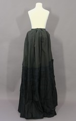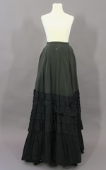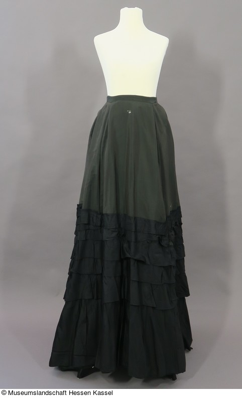 Der schmal geschnittene Rock aus einem grünlich-schwarzem Wollstoff ist vorne glatt und im Rücken stark angekraust gearbeitet. Außerdem ist die hintere Rockpartie gut 20 cm länger als vorne. Da außerdem am hinteren Rocksaum Verstärkungen für eine Schleppe fehlen, ist anzunehmen, dass der Rock nicht für eine Tournüre, sondern einen Cul de Paris gedacht war.