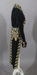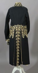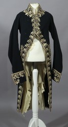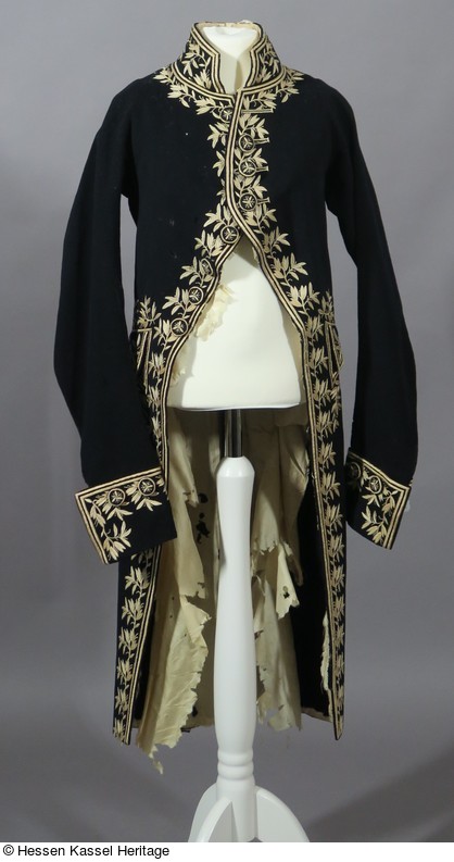 Der Frack aus schwarzblauem Tuch hat einen hohen Stehkragen, lange Ärmel mit aufgeschlagenen Manschetten und im Rücken mehrere eingelegte Faltenpartien. Er ist an Kragen, Vorderkanten, Manschetten, Taschenpatten und Rückenschlitz mit einem Pflanzendekor aus beigem bis hellorangem Perlgarn in Plattstich bestickt.