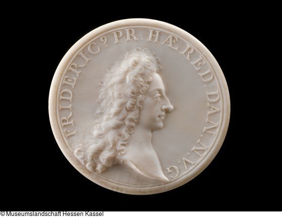 Das Medaillon zeigt den späteren dänischen König Friedrich IV. von Dänemark als Kronprinzen. Der damals etwa 24-Jährige als Porträtkopf mit tiefem Ausschnitt, aber ohne Kleidung, Schmuck oder Ordenszeichen dargestellt. Er trägt eine Perücke (oder Echthaar).
