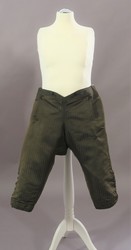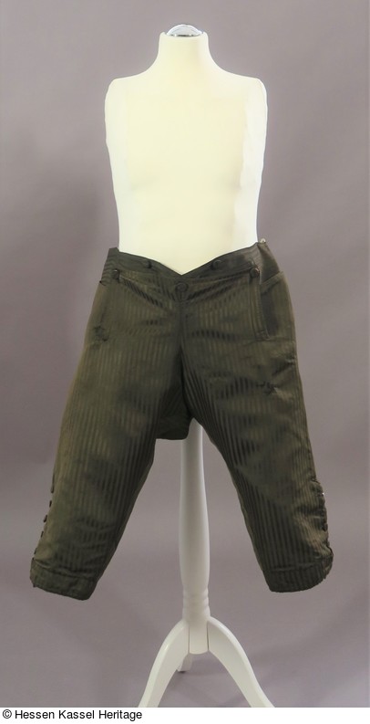 Die Kniebundhose ist aus einer feinen, gestreiften dunkelbraunen Seide hergestellt und zur Verstärkung auf ein helles, feines Leinen gearbeitet. Bis ins 19. Jahrhundert hinein wurden Herrenhosen mit dem sogenannten Hosenlatz geschlossen. Die beiden Beinteile der Hose waren in der Mitte von Bund im Rücken bis in den Schritt zusammengenäht und verliefen dann getrennt bis zur Taille auf der Vorderseite, wo sie mit Knöpfen oder Bändern geschlossen wurden. Den entstehenden Schlitz verdeckte der Hosenlatz, der als Zwickel im Schritt ansetzte und als breiter Streifen rechts und links von der Mitte am Hosenbund festgeknöpft wurde.