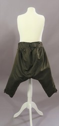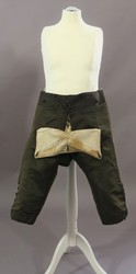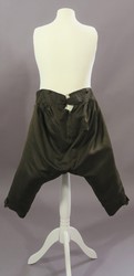 So ist auch diese Hose konstruiert, die in der 2. Hälfte des 18. Jahrhunderts entstand und die wahrscheinlich zu einem sogenannten englischen Anzug gehörte. Dieser Bestand in der schlichtesten Form aus Jacke, Weste und Kniehose aus einfarbigem Stoff. Bei aufwändigeren Ausführungen waren Kanten, Kragen und Taschenpatten der Jacke bestickt. Die Weste konnte passend gearbeitet oder als Kontrast komplett anders gestaltet sein.