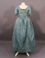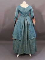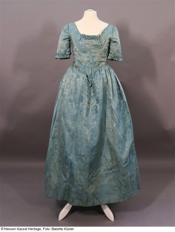 Das zweiteilige Damenkleid gehört zu einem Konvolut von Kleidungsstücken, die mehrere Änderungen erfahren haben. Dazu gehören (KP K 107c,d) noch zwei Damenjacken aus der Zeit von 1740 bis 1750. Aus dieser Zeit stammt auch die Seide dieses Kleides, das sehr wahrscheinlich aus dem oder den Röcken gearbeitet wurde, der/die ursprünglich zu den beiden Jacken gehörten.