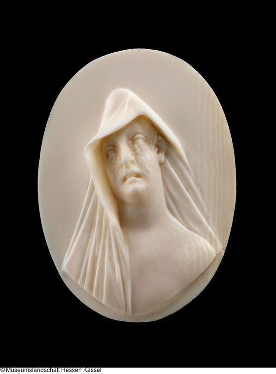 "Nur mit einem, von der rechten Brust über den Kopf gezogenen u. auf d. Rücken herunterfallenden Tuch bekleidetes weibliches Brustbild mit etwas nach der rechten Schulter geneigtem, Tränen überströmten Gesicht."
