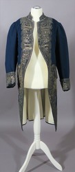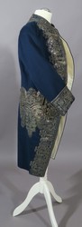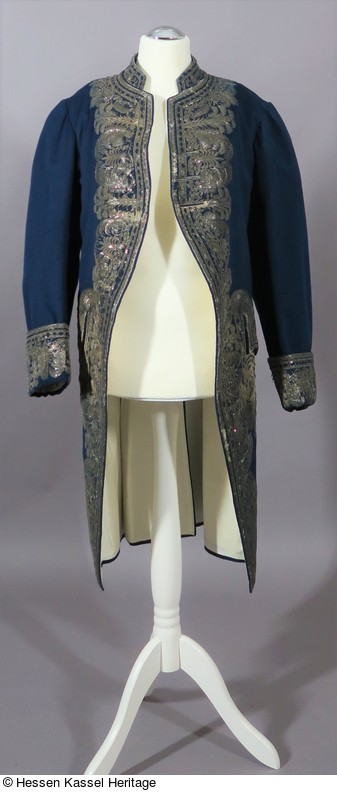 Diese Herrenjacke scheint nur auf den ersten Blick aus einem Stück zu bestehen. Bei genauerem Hinsehen ist zu erkennen, dass die üppige Silberstickerei, für die verschiedene Silberfäden, Bouillondrähte, gestanzte Flittern und Pailletten verwendet wurden, aus einem anderen, ebenfalls dunkelblauen Justeaucorps herausgeschnitten und auf dieses, neue Exemplar aufgenäht wurde. Inwieweit er dem alten Stück entsprach, ist nicht festzustellen. anhand des Zustandes der Stickerei kann aber gesagt werden, dass zumindest im Bereich des Kragens Veränderungen vorgenommen wurden.