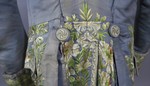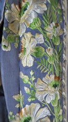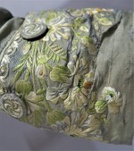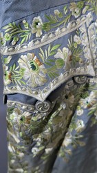 Diese Herrenjacke, als Justeaucorps bezeichnet, besteht aus einer lavendelblauen Seide und ist an allen Kanten, Kragen und Taschenpatten mit einem sehr üppigen Blumendekor bestickt.