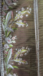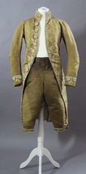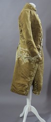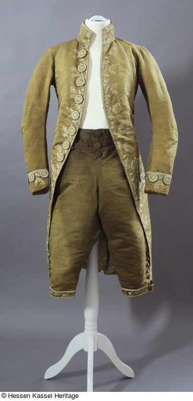 Die schmale Form der Jacke mit den weit zurückschwingenden Vorderteilen und der hohe Stehkragen sind Indizien dafür, dass der Anzug um 1780 entstanden ist. Auch die filigrane Blumenstickerei in hellen Farbtönen, mit der alle Kanten, Kragen und Taschenpatten der Jacke sowie die Säume der Hose eingefasst sind, ist ebenso typisch für diese Zeit, wie die großen, passend bestickten Knöpfe, die nur noch Zierde sind, da die Jacke nicht mehr zu schließen ist.