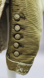 Heute erscheint die Seide dieses Herrenanzuges als ein Olivgrün, in den Falten der Gehschlitze im Justeaucorps, die nie dem Licht ausgesetzt waren, ist jedoch zu erkennen, dass die Seide ursprünglich in Violett und Grün changierte.