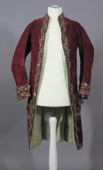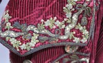 Diese Herrenjacke, als Justeaucorps bezeichnet, besteht aus himbeerfarbenem, seidenem Breitcord, einem sogenannten Manchestercord, der an Vorderkanten, Kragen Manschetten und Taschenpatten mit einer doppelten Wellenranke aus Blütenzweigen und Schleifenbändern bestickt ist. Für die Stickerei wurde farbige Seide verwendet, die Schleifenbänder und Kanten sind außerdem mit silbernen Pailletten akzentuiert.