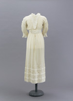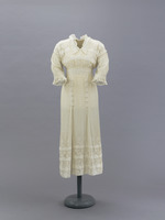 3/4 langes, weißes D-kleid, kurzen Ärmeln, z.T. eingewebtes erhabenes folorales Muster unter Taille, Doppelreihe Kugelknöpfe aus Stoff, kleiner V-Ausschnitt, rückwärtiger Riegel, V-förmige Verlängerung d. Kragens, Oberteil mit Netz gefüttert, Druckknöpfe