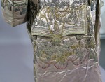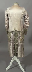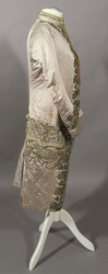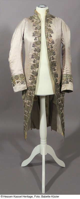 Der Seidenatlas und die reiche Stickerei, die nicht nur aus einfachen Seiden- und Metallfäden besteht, sondern für die außerdem Bouillondraht, Pailletten und farbige, façettierte Glassteine verwendet wurden, weisen diesen Justeaucorps als Teil eines Abendanzuges für höchste, repräsentative Anlässe aus. Er war Teil des sog. Habit à la français, zu dem eine Kniebundhose aus dem gleichen blass lila Seidenatlas und eine entsprechende Weste gehörten.