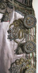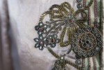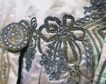Seide, Leinen, Metall (Bouillon, Pailletten, Faden), Glas (Strasssteine), Holz/Papier (Knopfkerne) |
