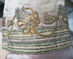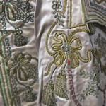 Die schmale Form der Jacke, der mäßig hohe Stehkragen und die Verteilung der Stickerei sind Indizien dafür, dass die Jacke um 1760 entstanden ist.