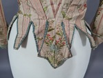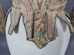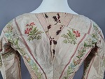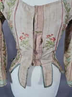 Dieser Pierrot besteht aus einer hellen gestreiften Seide mit Blütendekor. Der Ausschnitt ist auf der Vorderseite rund und läuft im Nacken spitz zu. Hier ist ein Zwisckel aus einem baumwollnen Druckstoff eingesetzt, der aber vermutlich eine Veränderung des 19. Jahrhunderts darstellt.