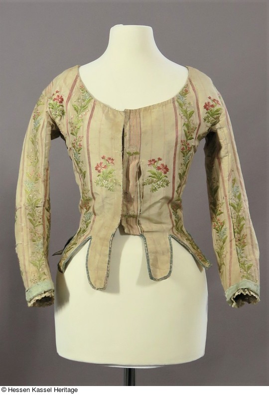 Diese Form des Damenmieders mit langen, engen Ärmeln und mit in schmale Streifen aufgeteiltem Schoß bezeichnet man auch als Pierrot. Diese Jacken wurden um 1785 über den besonders über dem Gesäß gepolsterten Röcken getragen, die als Cul de Paris bezeichnet wurden.