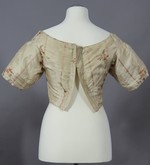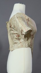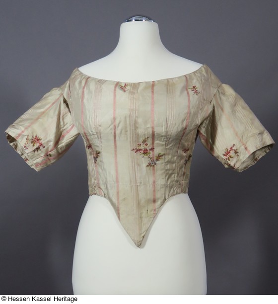 Dieses Objekt ist eine Leihgabe des Staatstheaters Kassel, für das ein weißer Seidentaft mit rosaweißen Kettstreifen und broschierten Blütensträußen verwendet wurde. Diese Seide stammt aus dem letzten Viertel des 18. Jahrhunderts, während das Mieder mit dem breiten, runden Ausschnitt, den kurzen Ärmeln und der langen Schneppe in der vorderen Mitte in der Zeit um 1840 entstanden ist.