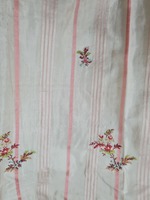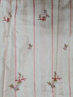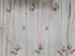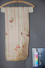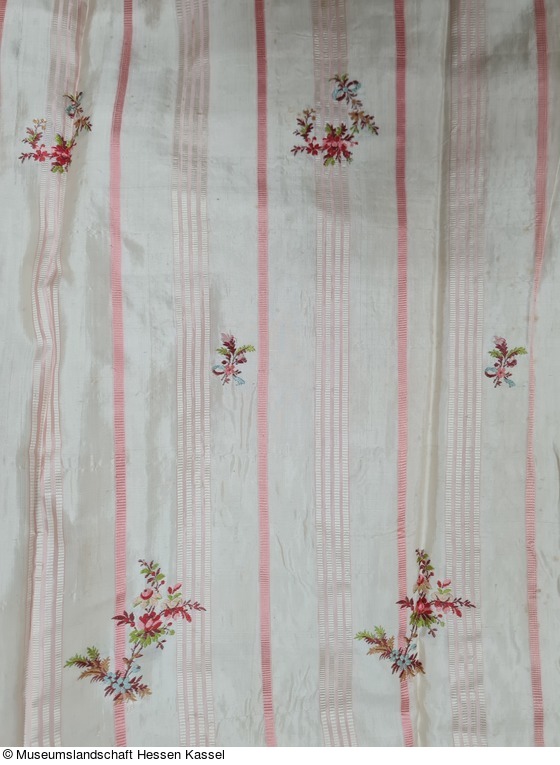 Dieses Objekt ist eine Leihgabe des Staatstheaters Kassel, für das ein weißer Seidentaft mit rosaweißen Kettstreifen und broschierten Blütensträußen verwendet wurde. Diese Seide stammt aus dem letzten Viertel des 18. Jahrhunderts, während das Mieder mit dem breiten, runden Ausschnitt, den kurzen Ärmeln und der langen Schneppe in der vorderen Mitte in der Zeit um 1840 entstanden ist.