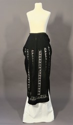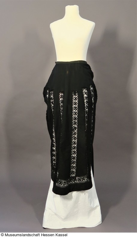 Schürze für ein Tournürenkleid aus schwarzem Wollstoff mit Spitzenensätzen, Perlen- und Bandgarnitur.