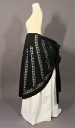 Die nahezu halbkreisförmige Schürze besteht vorne aus einem glatten Rechteck und mehreren am unteren Rand und an den Seiten angesetzten Kreissegmenten aus schwarzem Wollstoff, die durch Einsätze aus schwarzer Klöppelspitze verbunden sind. Die Kanten sind jeweils mit Reihen aus schwarzen Perlen besetzt.