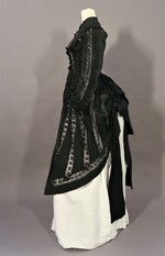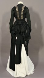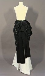 Im Rücken sind die äußeren Teile des Halbkreises in tiefe, übereinanderliegende Falten gelegt. An den Außenkanten, die genau wie der Bund im Rücken zusammengehakt werden, sind lange, schwarze Seidenbänder angenäht, die eine lange einheitliche Bahn bilden, wenn die äußeren Schürzenkanten über der Tournüre zusammengeschnürt werden.