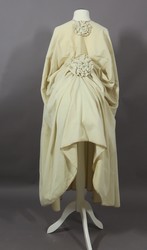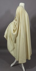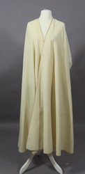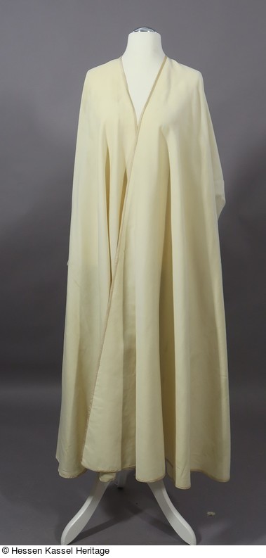 Der Burnus ist knöchellang und hat die Form eines großen Halbkreises. Alle Kanten sind mit Schrägstreifen aus beigem Seidenköper eingefasst.