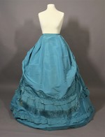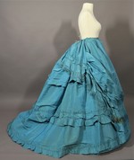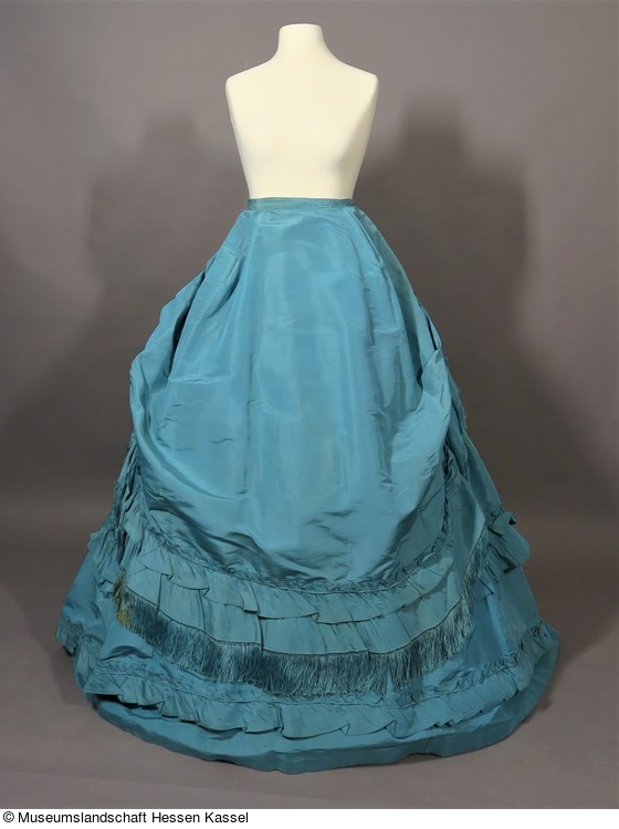 Auf dem Rock liegen übereinander 2 leicht angekrauste Volants, deren untere Kanten wiederum mit nun stärker angekrausten Volants besetzt sind. Der Abstand zwischen den beiden Garniturstreifen wird zur hinteren Mitte hin größer. Über der Rückpartie ist eine weitere, oben stark angekrauste und unten mit einem angekrausten Volant besetzte Stoffbahn angenäht, die bis auf die Oberkante des oberen Garniturstreifens reicht. Über dem Rock liegt außerdem ein Schürzenrock, der vorne bis an den unteren Garniturstreifen recht. Diese vordere Bahn ist an den Seitennähten hochgerafftbis zur Länge der rückwärtigen Bahn, die etwa bis zum Gesäß reicht. Der gesamte Saum ist mit einem angekrausten Volant mit Kopf besetzt und die untere Kante mit einer hellblauen Seidenfranse eingefasst. Über der rechten Hüfte ist hier eine Nahttasche eingearbeitet.