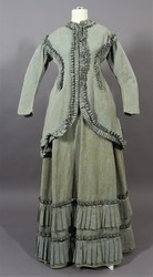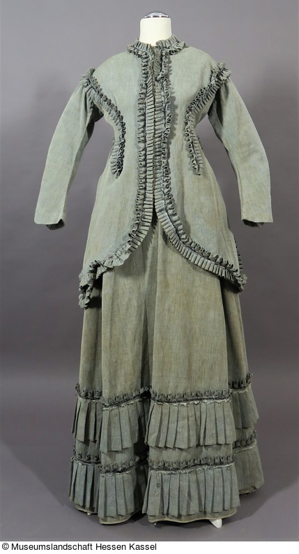 Das Ensemble aus grauer Halbwolle (Kette: weiße Baumwolle, Schuss: schwarze Wolle) bestand wohl ursprünglich aus Rock, Oberteil, garniertem Gürtel und einer Überjacke. Das Oberteil ist nicht vorhanden, eventuell handelt es sich bei den losen Besätzen um die abgetrennten Schöße dieser Jacke.