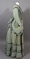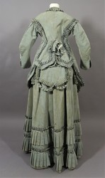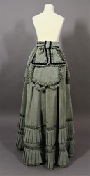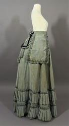 Der Rock ist vorne glatt am Bund angesetzt, an den Seiten in tiefe Falten gelegt und im Rücken angekraust. So entsteht eine Silhouette, die den Übergang von den ausladenden Krinolinenröcken zur schmalen Tournüre bildet. Eine Schleppe ist nicht vorhanden.