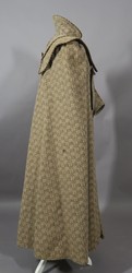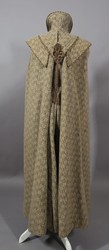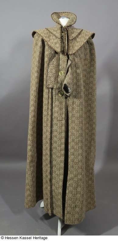 Knöchellanges Cape mit über den Schultern stark angekrausten Seitenpartien. Ein separater Umlegekragen zum Binden umschließt den Hals mit einem hohen Kelchragen, der im Nacken in einen Schwalbenschwanz ausläuft. Darunter liegt eine weitere Kragenpasse, die vorne spitz zuläuft und im Rücken in einer Rundung endet.