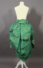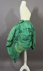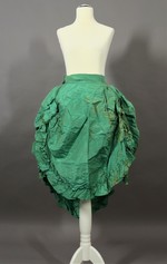 Der Überrock aus apfelgrüner Seide ist aus 4 Bahnen zusammengesetzt, die vorne glatt, an den Seiten und im Rücken aber in breiten Falten am Bund angesetzt sind. Der Rocksaum ist mit einem angekrausten Volant mit Kopf eingefasst und verläuft von vorne nach hinten in einem flachen Bogen nach unten. Diese Linie wird unterbrochen durch die Raffungen an den Seitennähten, die jeweils am oberen Ende mit einer Schleife aus dem Rockstoff besetzt sind.