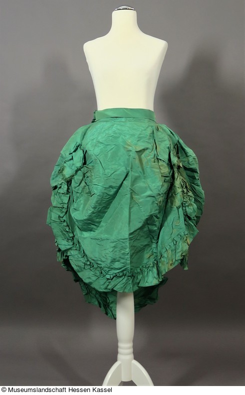 Der so entstehende bauschige Umriss wurde durch den versteiften, gleichfarboigen Gürtel noch vergrößert. Er wird im Rücken mit Haken und Ösen geschlossen, auf dem Verschluss sitzt eine große Schleife mit langen Bändern, die über den Rückenbausch des Überrockes fallen. Darunter wurde ein großer, ovaler Krinolinenrock getragen, dessen größte Ausdehnung im Rücken lag.