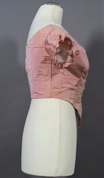 Das Mieder eines Ballkleides aus rosa Seide hat sehr kurze Ärmel und einen breiten Ausschnitt. Es ist auf Figur gearbeitet, läuft vorne in einer langen Schneppe aus und wird vorne mit 6 mit dem Kleiderstoff bezogenen Knöpfen geschlossen. Der rückwärtige Saum ist gerade und die Ärmel sind mit einem ausgezackten, doppelten und in Falten gelegten Volant garniert.