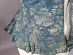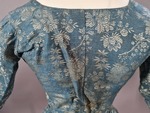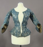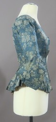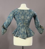 Dieser Caraco aus blauem Seidentaft mit weißem Blütendekor hat einen mäßig weiten Halsausschnitt, halblange Ärmel mit lose angesetzten Volants und wurde vorne geschnürt.