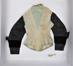 Die eingesetzten Ärmel sind aus schwarzem Seidenmoirèe und am Unterarm mit einem breiten Streifen aus blauem Samt mit einer ebensolchen Schleife besetzt. Das Futter besteht aus heller Baumwolle, die vorderen Teilungsnähte sind durch Fischbein versteift.