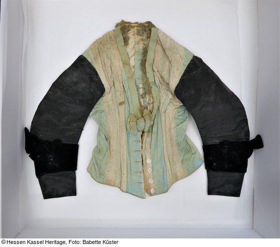 Dazu existiert eine Tournürenschürze aus dem Stoff des Oberteils (Inv. Nr. KP K 211b). Es wäre deshalb möglich, dass der nicht mehr vorhandene Rock zu diesem Kostüm aus dem Moirée der Ärmel und passenden Samtgarnierungen bestanden hat.