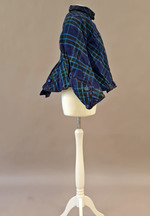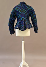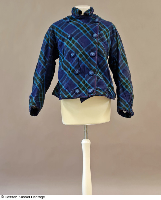 Die taillenkurze Damenjacke ist aus einem karierten Wollstoff hergestellt, der im Diagonalfadenlauf verarbeitet wurde. Auf diese Weise erscheint der hellblau-grüne Karodekor als Rautenmuster auf dem tiefblauen Grund.