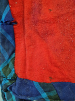 Die Jacke mit einem leuchtendroten Wollstoff gefüttert.