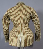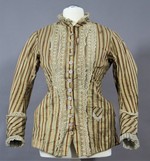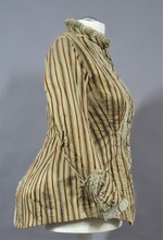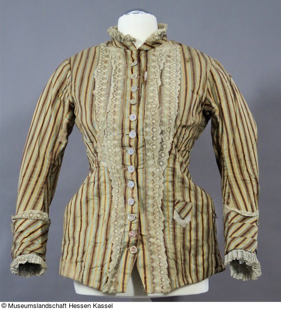 Auf der linken Seite ist auf Hüfthöhe eine kleine Uhrentasche aufgesetzt, die aus der gestreiften Seide und einem hellen, feinen Wollköper besteht. Da der Jackensaum innen mit dem gleichen Wollgewebe abgefüttert ist, handelt es sich vermutlich um den Stoff des nicht mehr vorhanden Rocks, der dann mit der gestreiften Seide garniert gewesen sein dürfte.