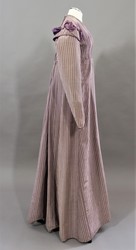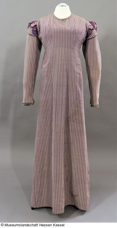 Das sehr schlichte Empirekleid hat einen engen Halsauschnitt und überlange Ärmel. Der Stoff ist längs gestreift, die Streifen bilden jeweils einen Farbverlauf von Dunkelviolett zu Weiß.