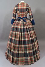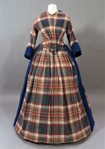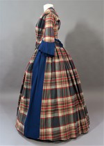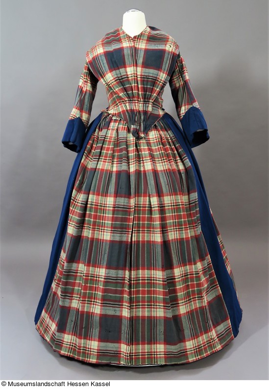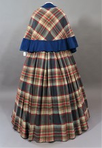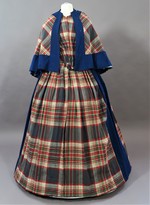 Vervollständigt wird das Ensemble durch eine hüftlange Pelerine aus kariertem Wollstoff, die an allen Kanten mit breiten, königsblauen Blenden eingefasst und besetzt ist. Das Futter besteht aus blauem Seidentaft.