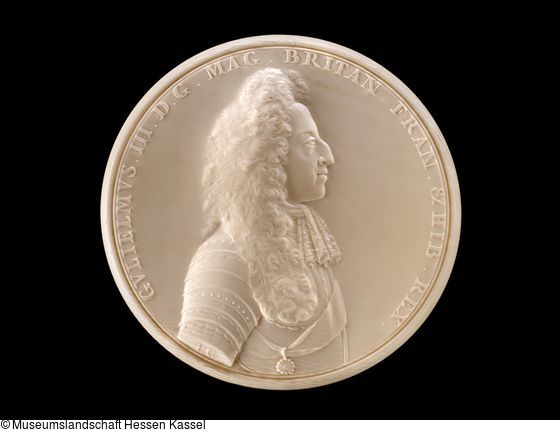 Heute sind neben dem Kasseler Medaillon noch drei weitere Porträts bekannt, die auf die königliche Porträtsitzung zurückgehen dürften (London, Victoria and Albert Museum (Inv. Nr. A.18-1938), Berlin, Skulpturensammlung (Inv. Nr. 719), Galerie Lowet de Wotrenge, Antwerpen). Es bleibt unklar, welches der Medaillon für den König bestimmt war. Mehrere Indizien sprechen dafür, dass das Kasseler Porträt eher für den Sammlermarkt bestimmt war. Zum einen bleibt es in der Detailbehandlung, etwa der eher schematischen Ausarbeitung der Quarréperücke, hinter den Medaillons in Berlin und London zurück. Auch das Kleinod des Hosenbandorden, im Berliner Exemplar eine winzige Darstellung des Heiligen Georgs im Kampf mit dem Drachen, ist hier vereinfacht als perlenumrahmter Schmuckstein dargestellt. Nicht zuletzt bleibt das Medaillon mit nur 77 mm Größe deutlich hinter den Medaillons in London (90 mm) und Berlin (96,5 mm) zurück - lediglich das Medaillon im Kunsthandel ist kleiner. Größer ist auch das Medaillon Königin Marias II. von England, der Gemahlin Wilhelms III. (KP B VI/II.6, 99,8 mm ). Vermutlich handelt es sich nicht um Gegenstücke, sondern um Werke, die für unterschiedliche Adressaten entstanden sind.
