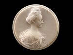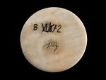 Elfenbein, gedrechselt, geschnitzt, geschabt und poliert. Reliefgrund zu Mitte hin einsinkend. Auf der Rückseite am Rand konzentrische Drechselspuren, Parallelschraffuren und Kratzer. |