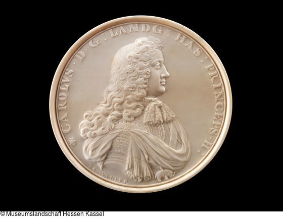 unterhalb des Landgrafenporträts: I CAVALIER; Avers: [Blüte] CAROLVS · D · G : LANDG : HAS : PRINCEPS · H :; Revers: MARIA : AMELIA : L:D : H : NAT : D : C : D : 1688;