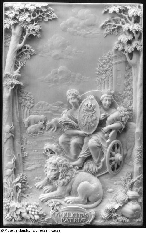"Am unteren Bildrand Kartusche mit: "FELICITAS PATRIAE" daneben Früchte. Am rechten u. linken Bildrand hohe Bäume, dazwischen eine Landschaft mit Gebäude und Kühen: Cybele und Ceres in einem zweirädrigen Wagen sitzend, vor dem Wagen ein liegendes Löwenpaar. Ceres hält in Händen ein Schild mit dem Spiegelmonogramm Landgraf Friedr. I. unter der Königskrone."