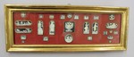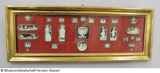 27 kleine Reliefembleme aus Elfenbein in einem Rahmen