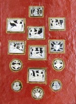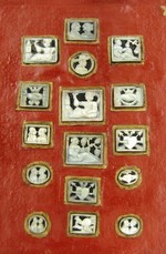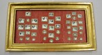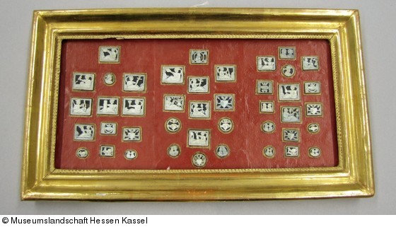 42 kleine Reliefembleme aus Elfenbein in einem Rahmen