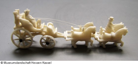 Elfenbein, geschnitzt, gesägt und gebohrt, Rosshaar (?), Silber (Deichsel) |